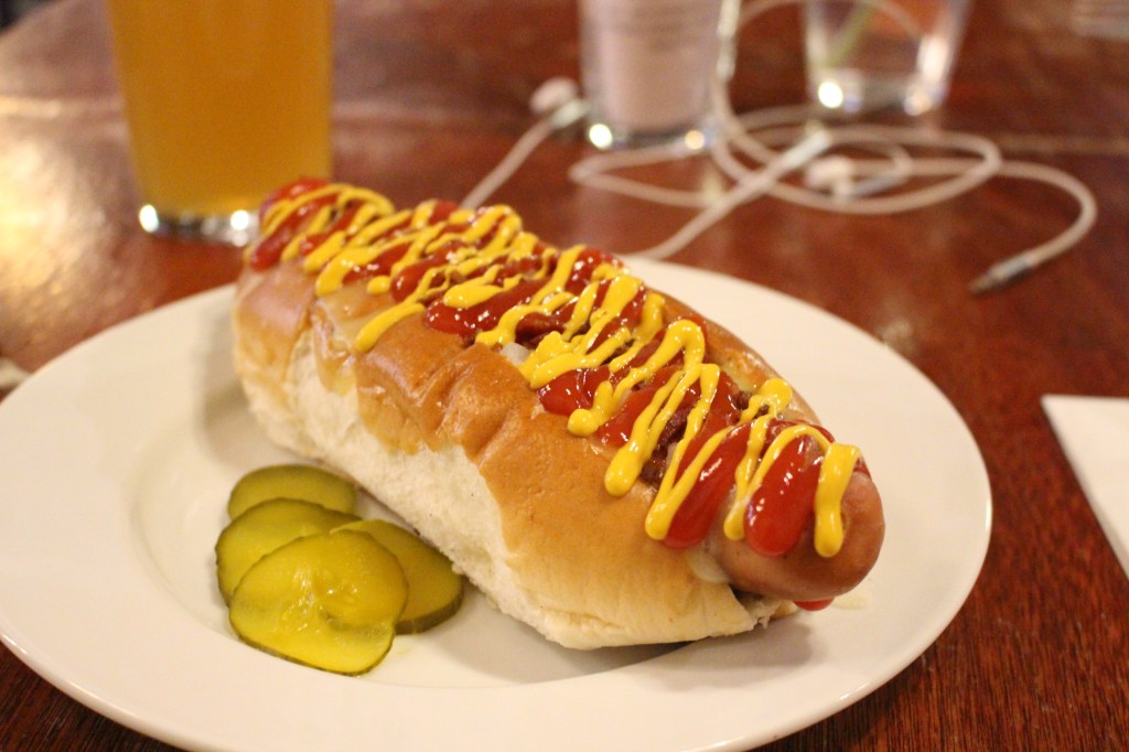 As always, the most important part is the beer! My main pint of choice was from local brewery 40ft who are based out of Dalston and are very close by. You may remember my review on ‘Dalston Sunrise‘ where I said it tastes better on draft. Well just to double check I wasn’t imaging things I had a pint and it was fantastically fresh and fruity. The perfect accompaniment to my monstrous hot dog. They have a couple of Portobello’s own beers own including their two lagers (of which the Helles is great) as well as their Christmas brew on cask. It was nice to see that even in these uncertain times, a commitment to having a couple of hand pumps up and running.