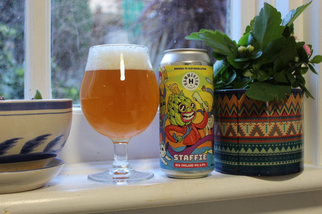I’ve got a rather interesting beer to review today. Hammerton, over the New Year period created a beer especially for hospitality workers and gave it out for free to all customers. Naturally, as a pub manager, this included a case for myself and the team. Named ‘Staffie’, which for those who don’t know, is a drink you get after finishing your shift. They’ve brewed this beer as a non-profit non-resale beer which is quite a lovely gesture. They’ve gone for a New England IPA at fairly punchy 6.9% for a free beer. Regardless of the gesture I will, as always, be impartial in my review!