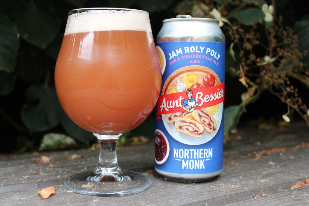 When I saw this beer pop up on the shelves of Morrison’s booze aisle I couldn’t believe it. This Northern Monk collaboration with one of frozen food’s most iconic brands ‘Aunt Bessie’s’ was released around the time I first started this blog, as a one off special. It appears, however, that there has been a re-brew of the beer for the shelves of Morrison’s supermarkets. The collab is a jam and custard pale ale inspired by the iconic British pudding, Jam Roly Poly. It comes in at a sessionable 4.5% ABV and in my mind was either going to be a massive win or big flop.