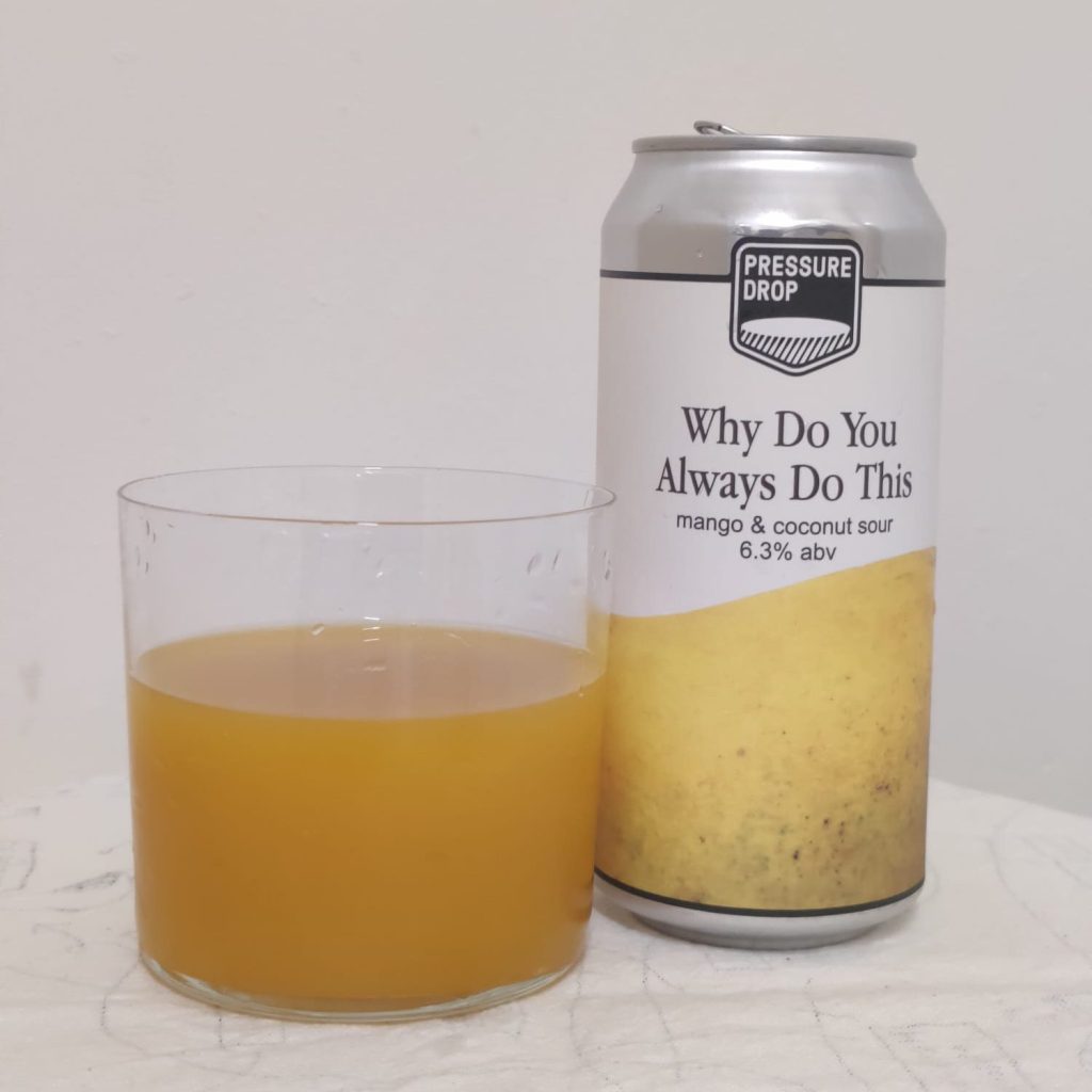 My girlfriend and I were on a lovely walk last week from Hackney Marshes to Victoria Park when we walked past what looked like the world fanciest SPAR shop of all time. Naturally, we popped in and spent a few minutes gawking at the variety of overpriced organic produce they had, before heading to the booze aisle. A very respectable range of craft beer from around London and beyond presented itself, including the beer for today’s review. ‘Why Do You Always Do This’ is a Mango & Coconut sour from Pressure Drop Brewing. Based in North London and brewing since 2013, Pressure Drop are considered one of the heavy hitters of the UK Craft Beer scene. I’ve had a few of their beers in the past, but this is the first time posting about them.