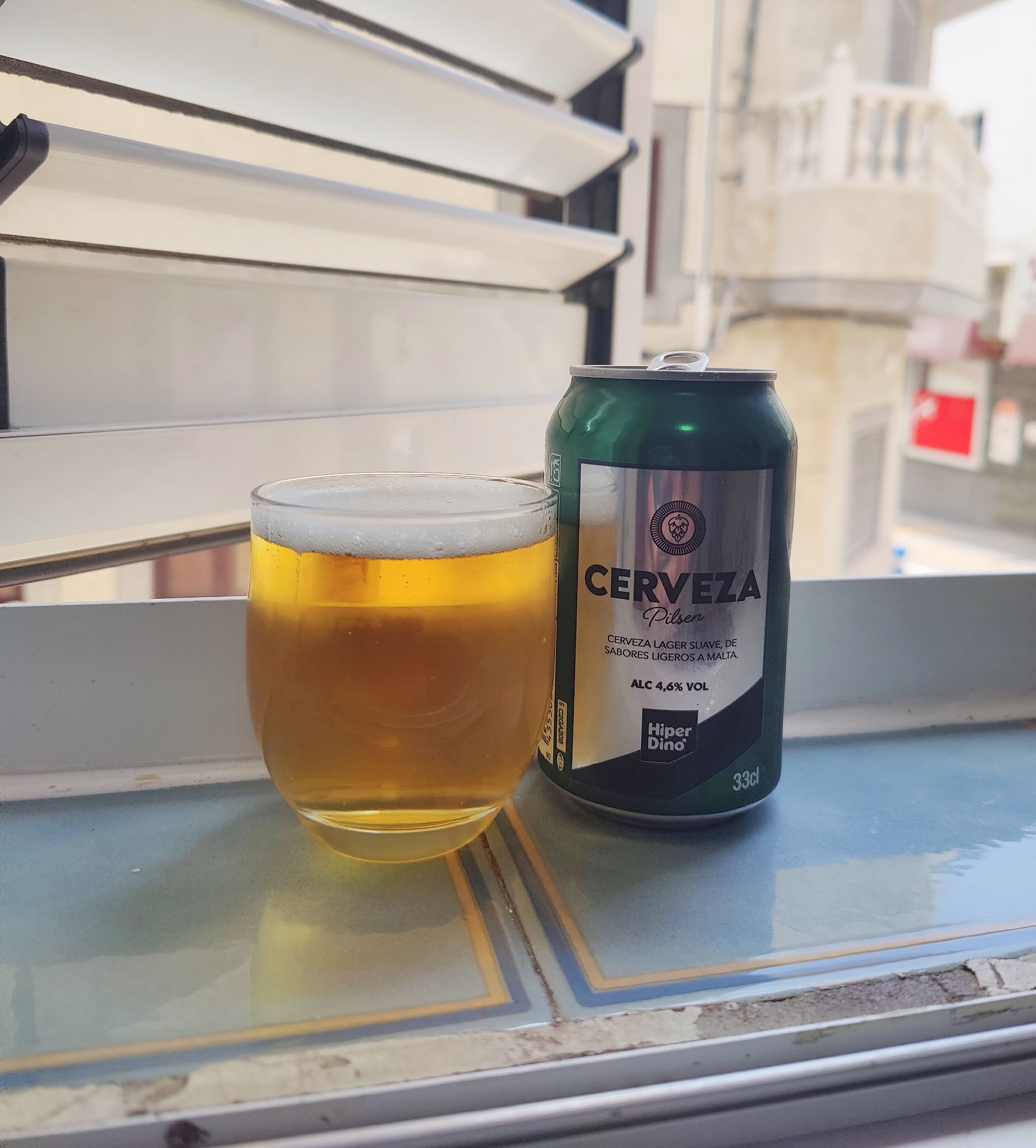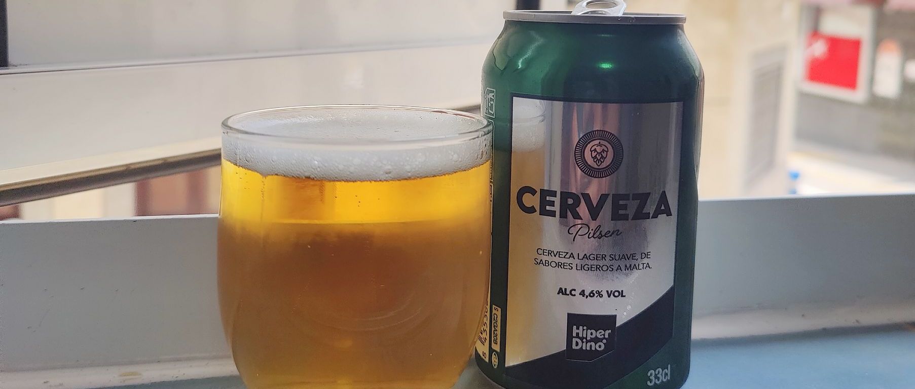 The Canary Islands have a budget supermarket chain called HiperDino, and on our holidays to visit family, that is where we do our shopping. It’s got everything you need at fairly reasonable prices. As I discovered this also includes 29 cent cans of beer, titled exactly as such in Spanish; Cerveza. It is, of course, a lager (pilsner, apparently, to be specific) and comes in at a surprisingly strong 4.6%ABV. I couldn’t resist finding out what a beer that cheap tastes like, so here we are!